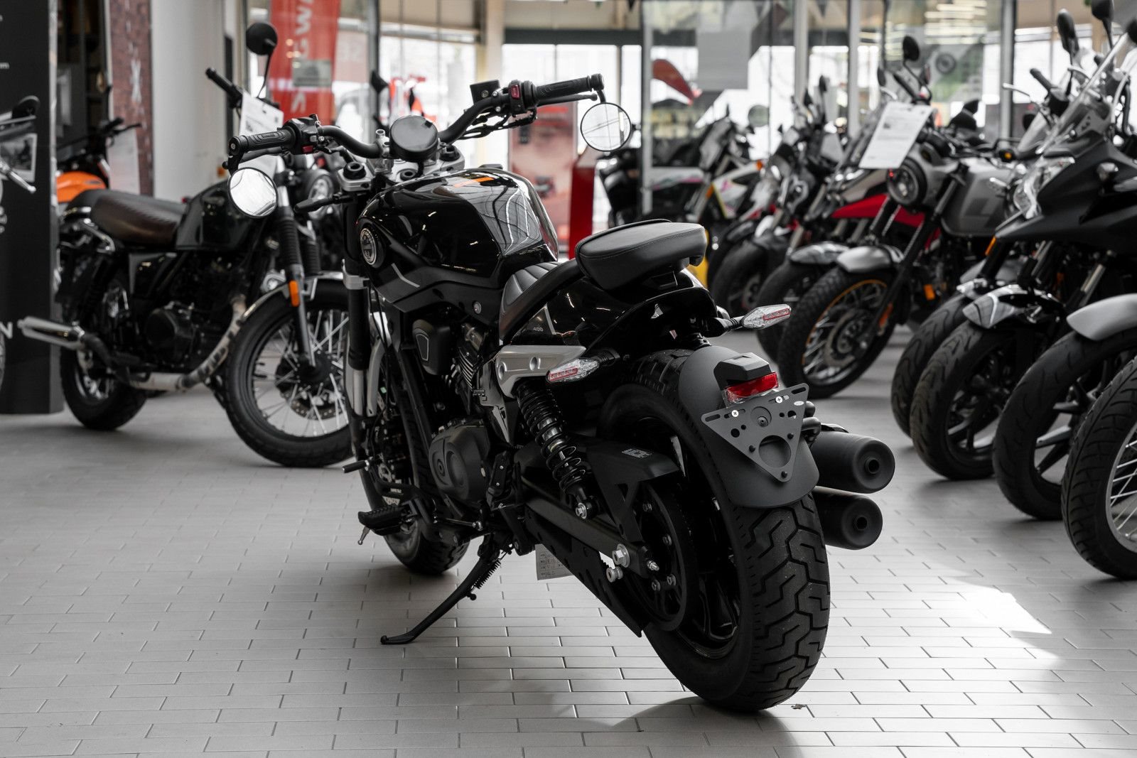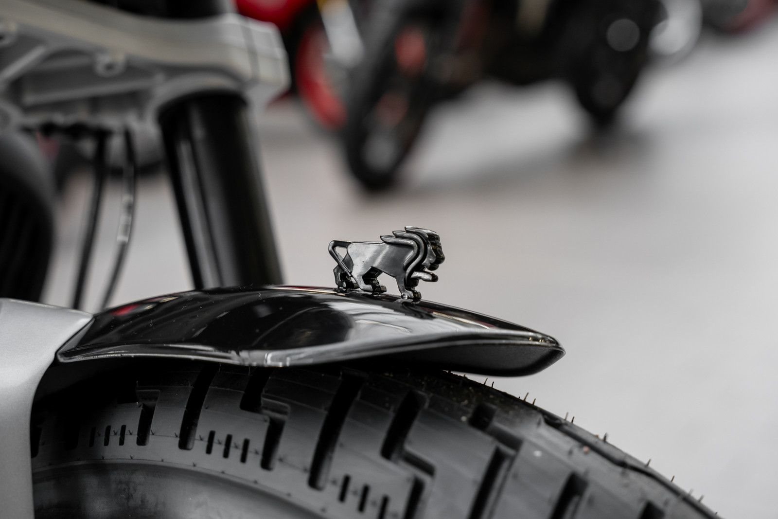 Markante Merkmale wie das minimalistische Frontschutzblech mit Löwen-Emblem, der tiefe, kompakte Aufbau mit Doppelauspuff und das kurze Heck betonen ihren Bobber-Stil.