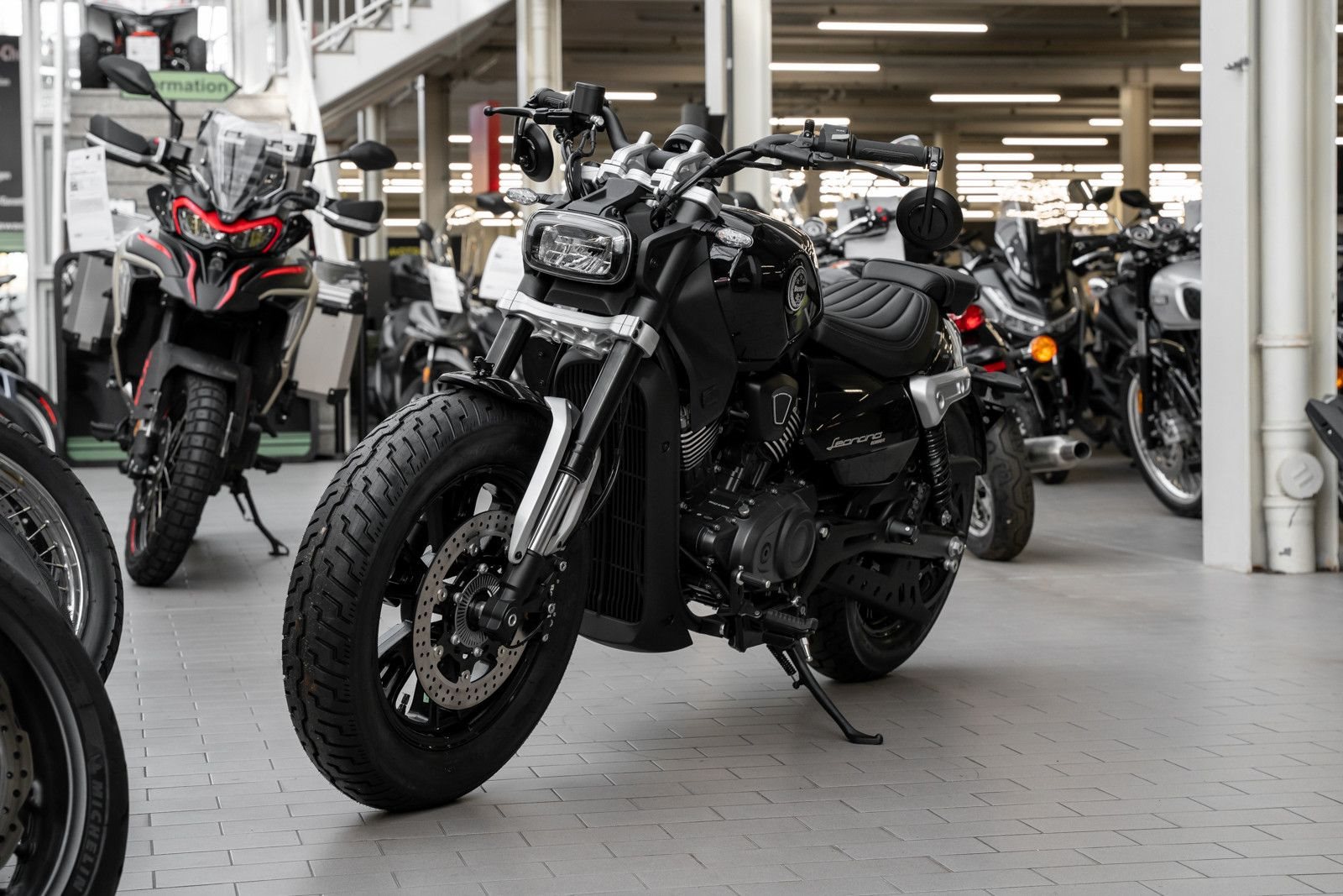 Der charakteristische Tank, das LED-Frontlicht mit geschwungenem Lichtband und die seitlichen Embleme verweisen auf die Leoncino-Tradition.