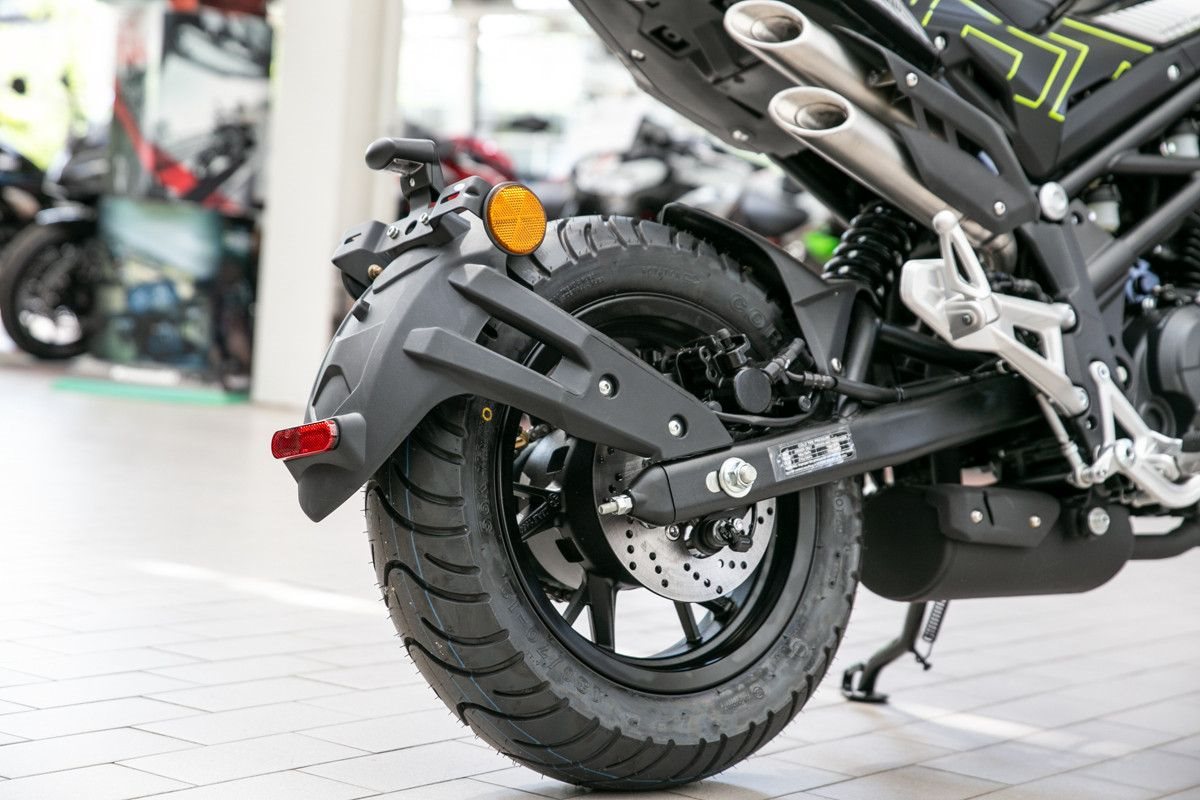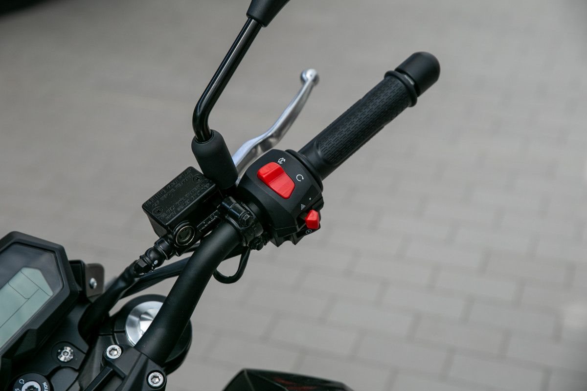 Befeuert von einem luftgekühlten 125 cm-Motor mit 2 Zündkerzen und ausgestattet mit fortschrittlicher Federung, einem verwindungssteifen Stahlrahmen, Leichtmetallfelgen, Scheibenbremsen, Allwetterreifen zaubert dieses rassige Naked-Bike allen ein Grinsen auf die Lippen.
