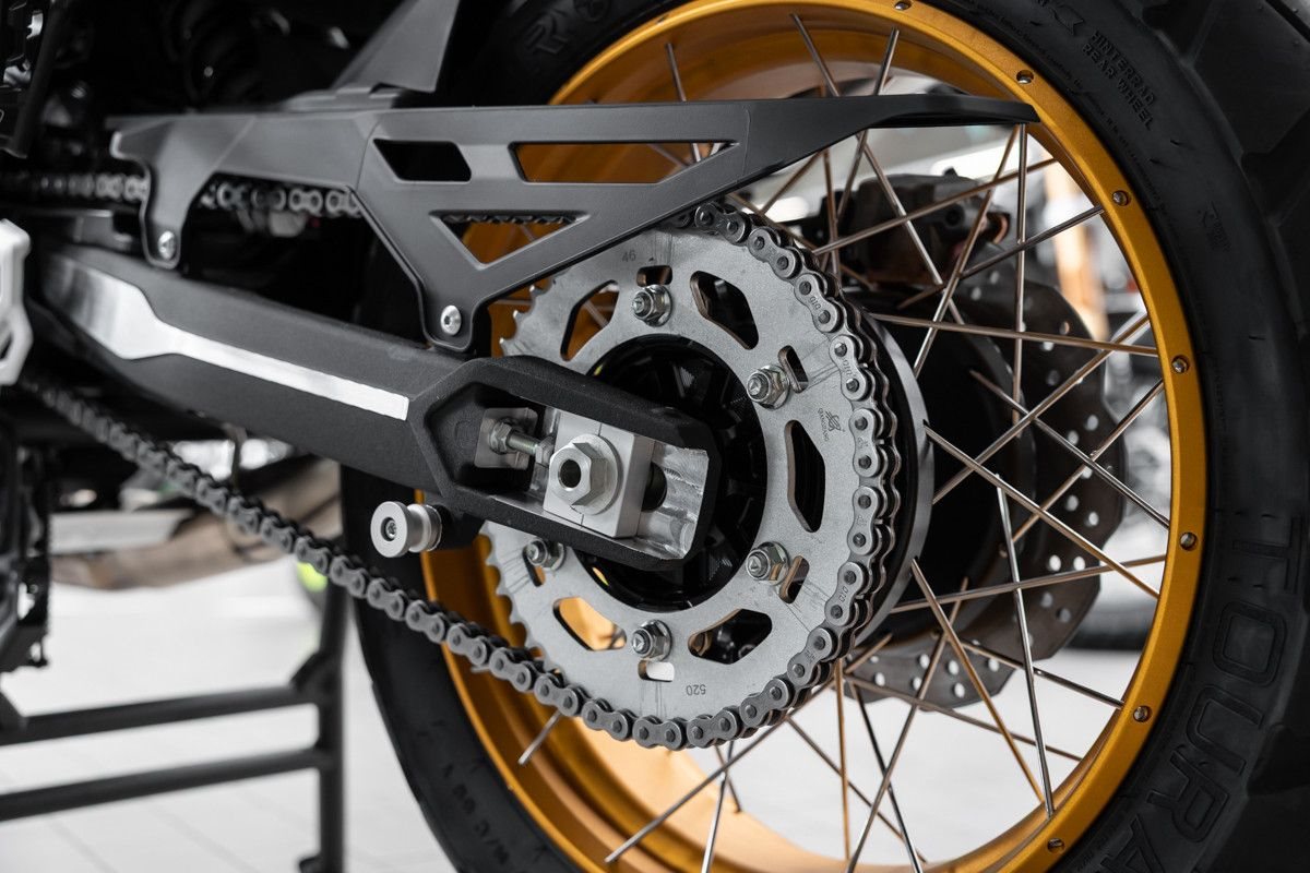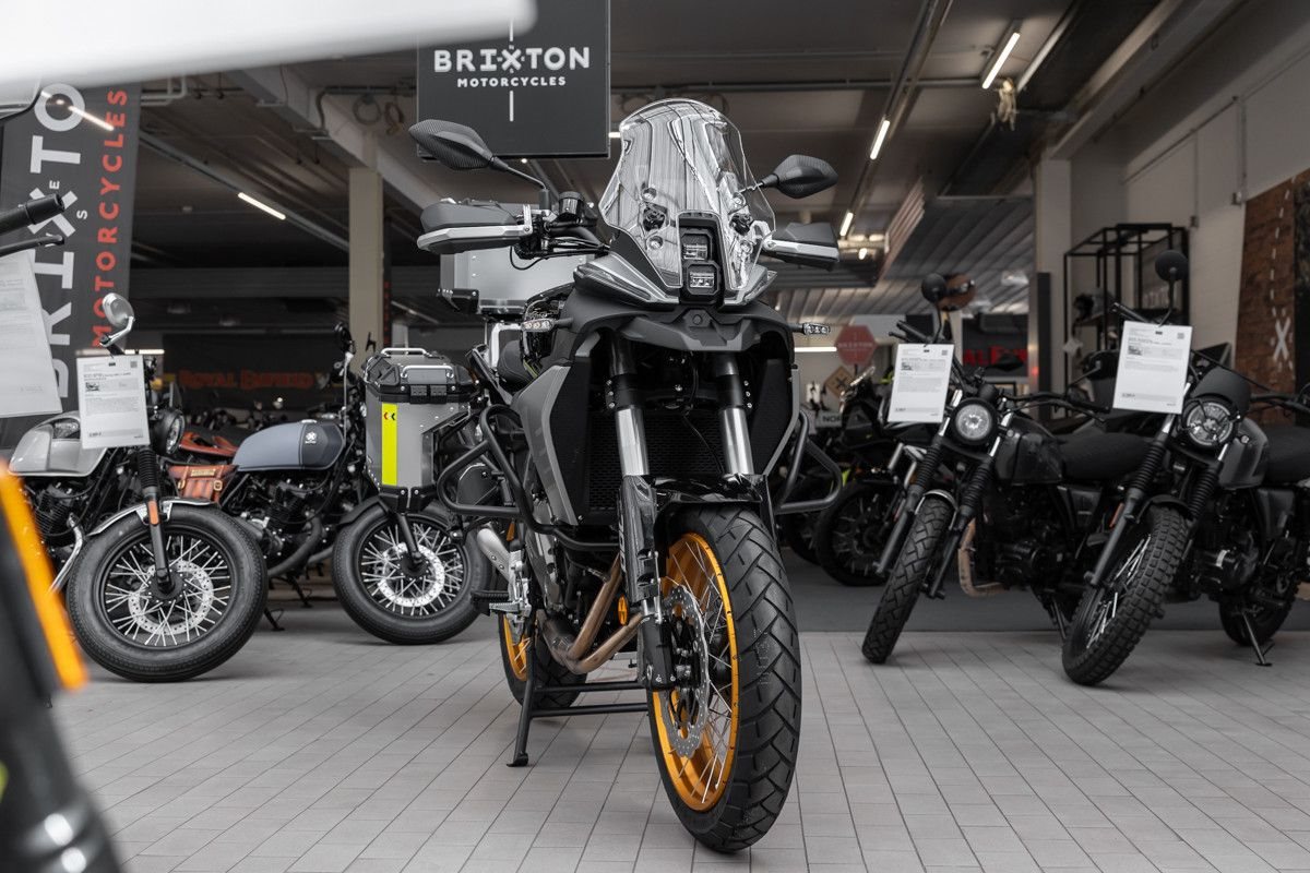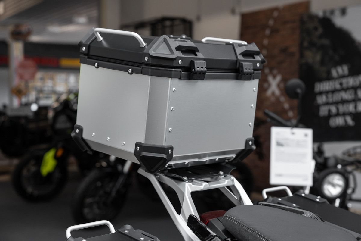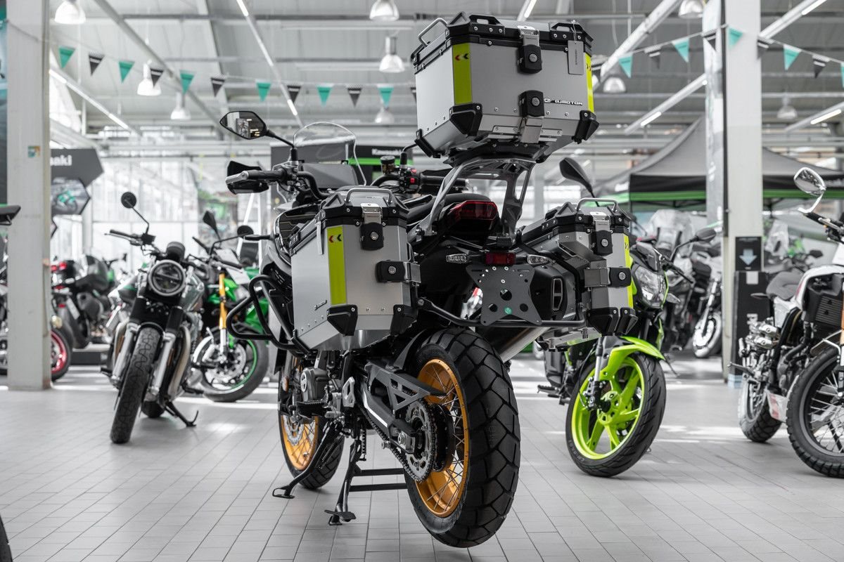 Das praktische Kofferset bietet ausreichend Stauraum für Ausrüstung, während die Marzocchi-Gabel für präzises Handling und exzellenten Fahrkomfort sorgt.